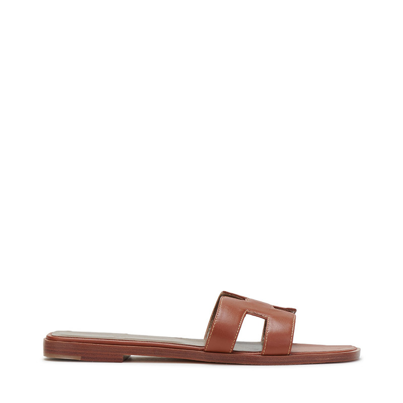 Moda de verano de piel de vaca de color marrón de mujeres sandalias planas con H hueco superior